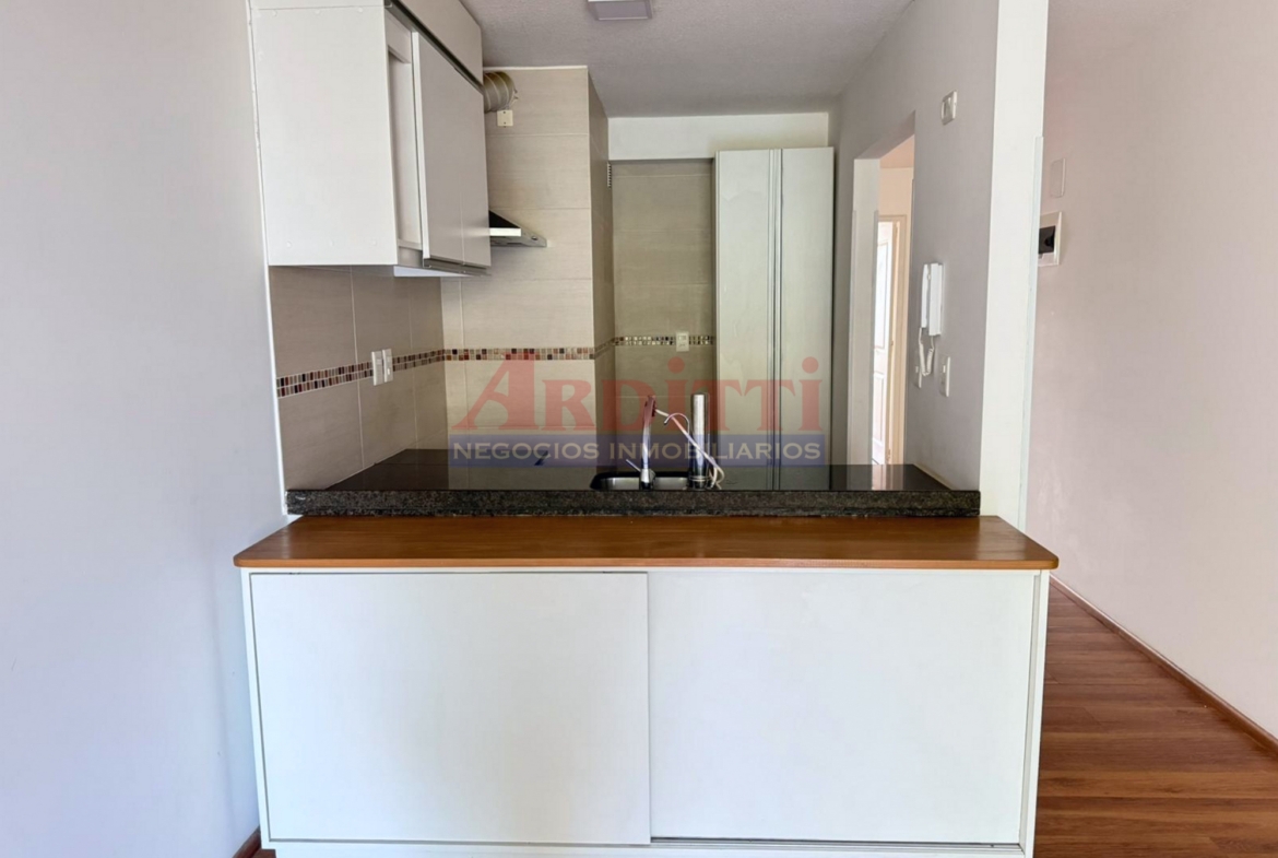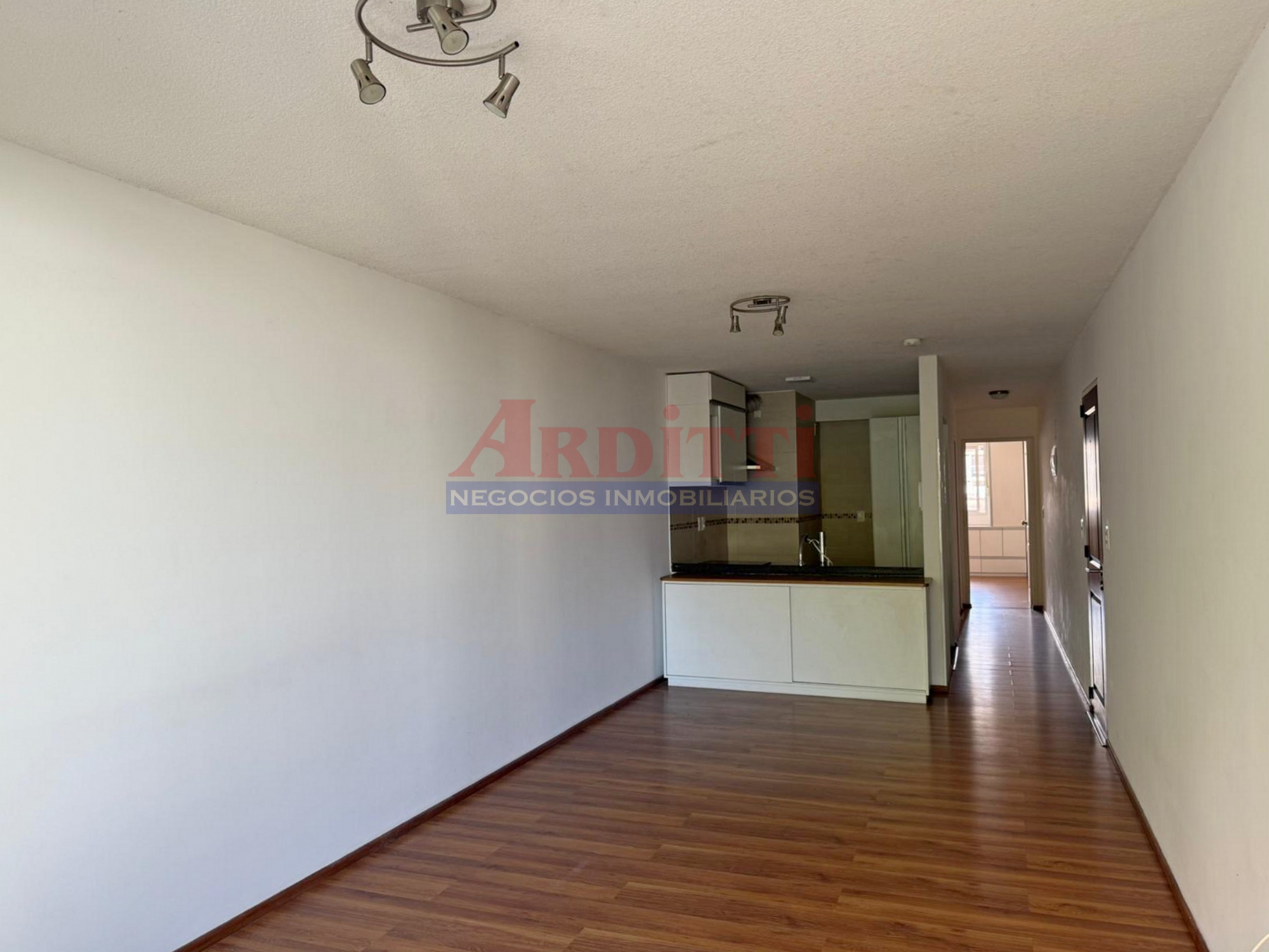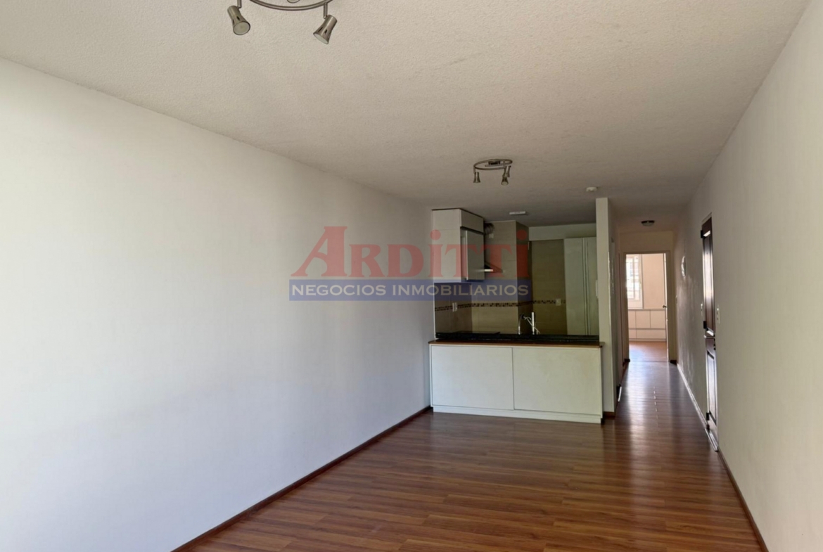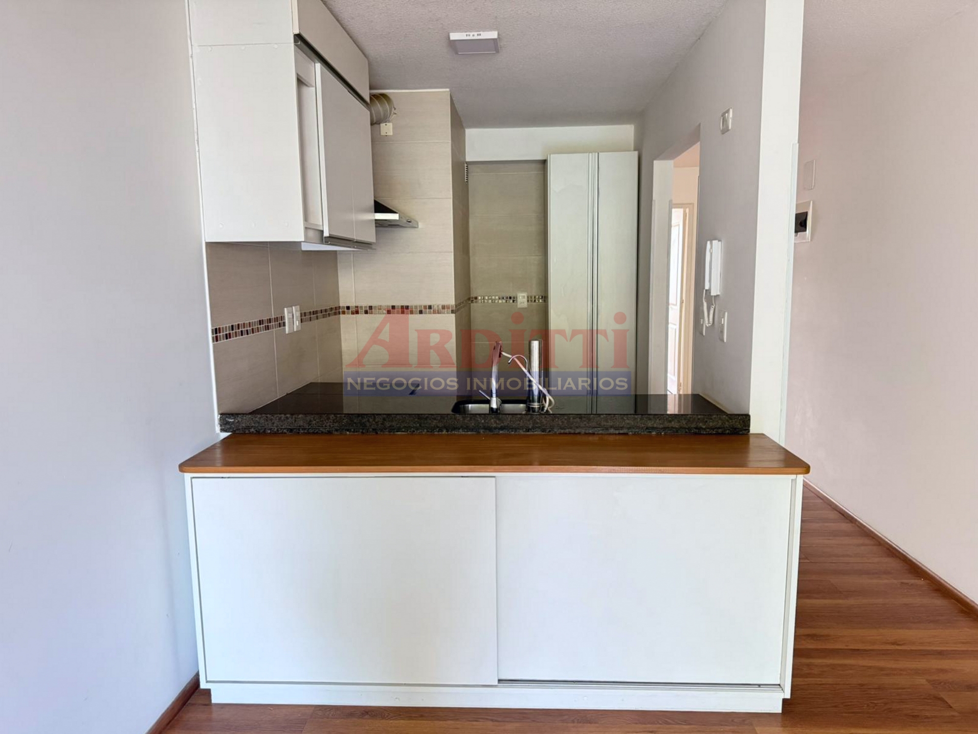 Living comedor con terraza al frente, cocina americana con muebles de guardado, 1 dormitorio con placares y baño. 50m²