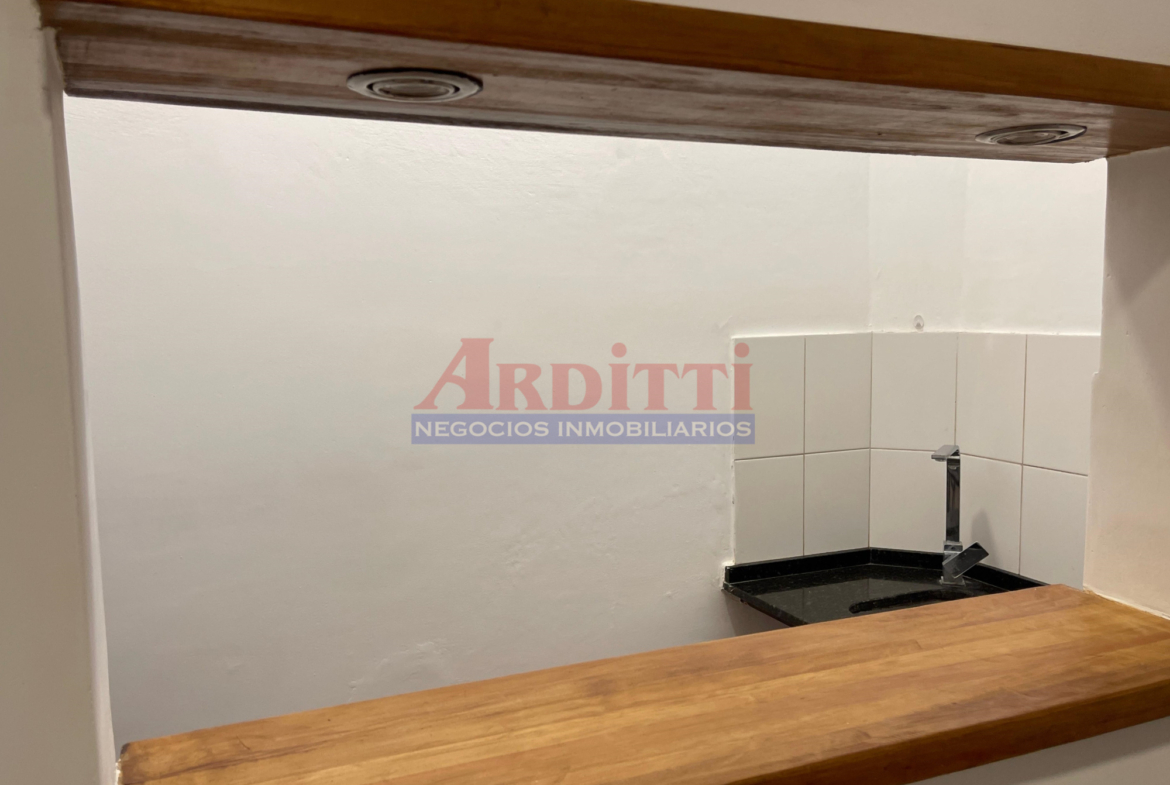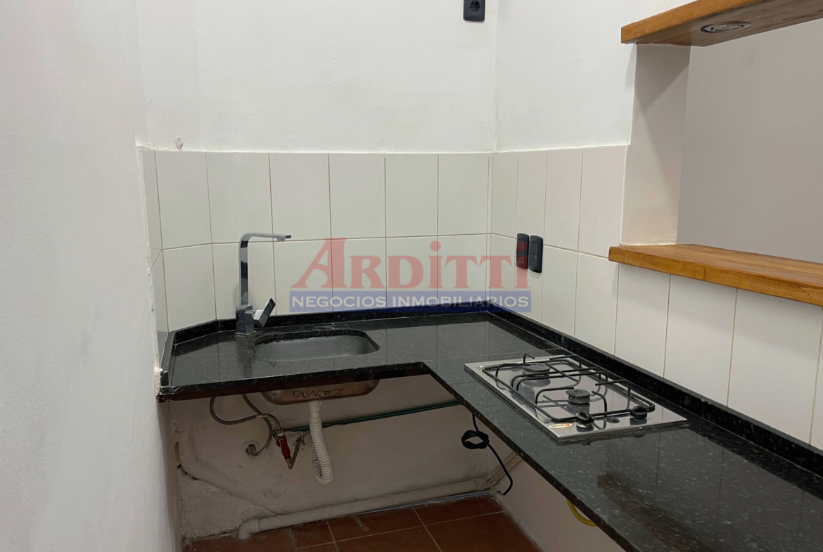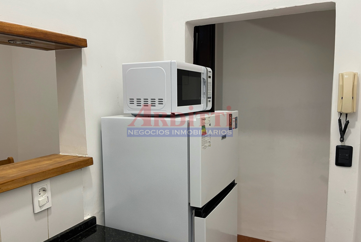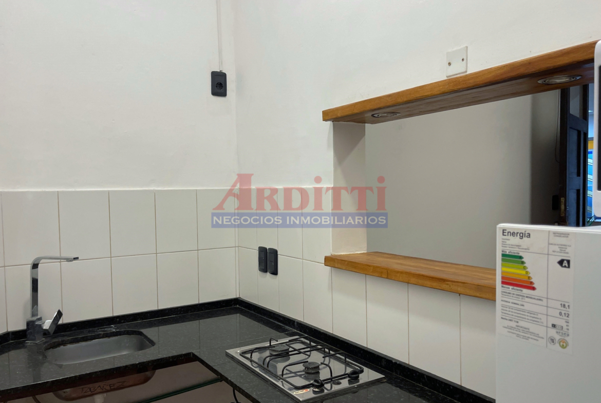 Living comedor con pasaplatos, 1 dormitorio, cocina definida con anafe, microondas y baño. 35m2