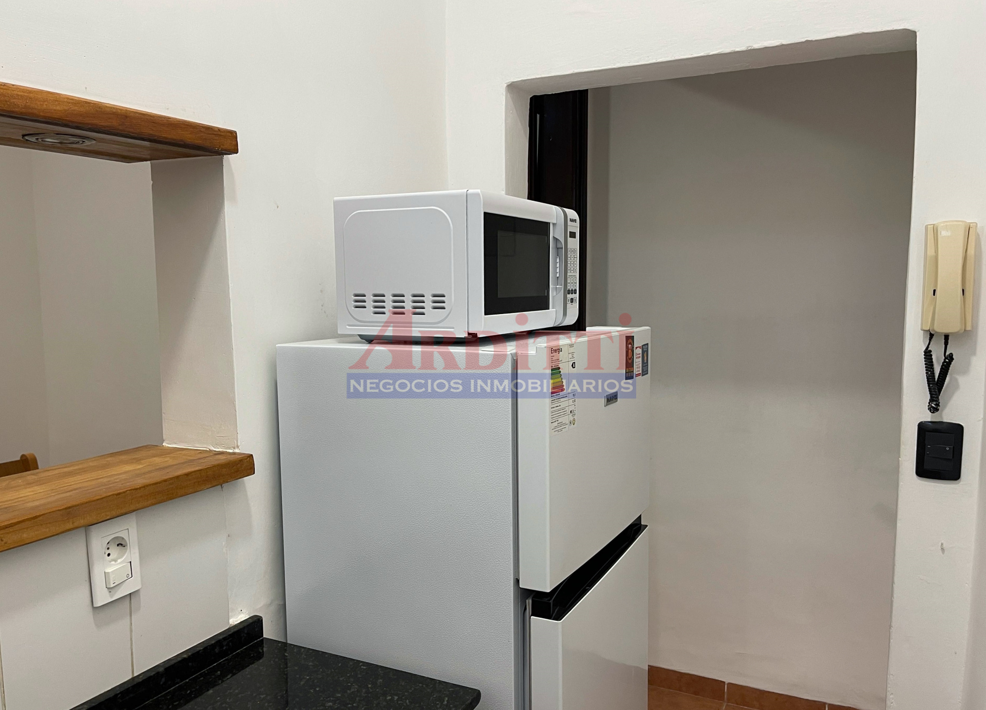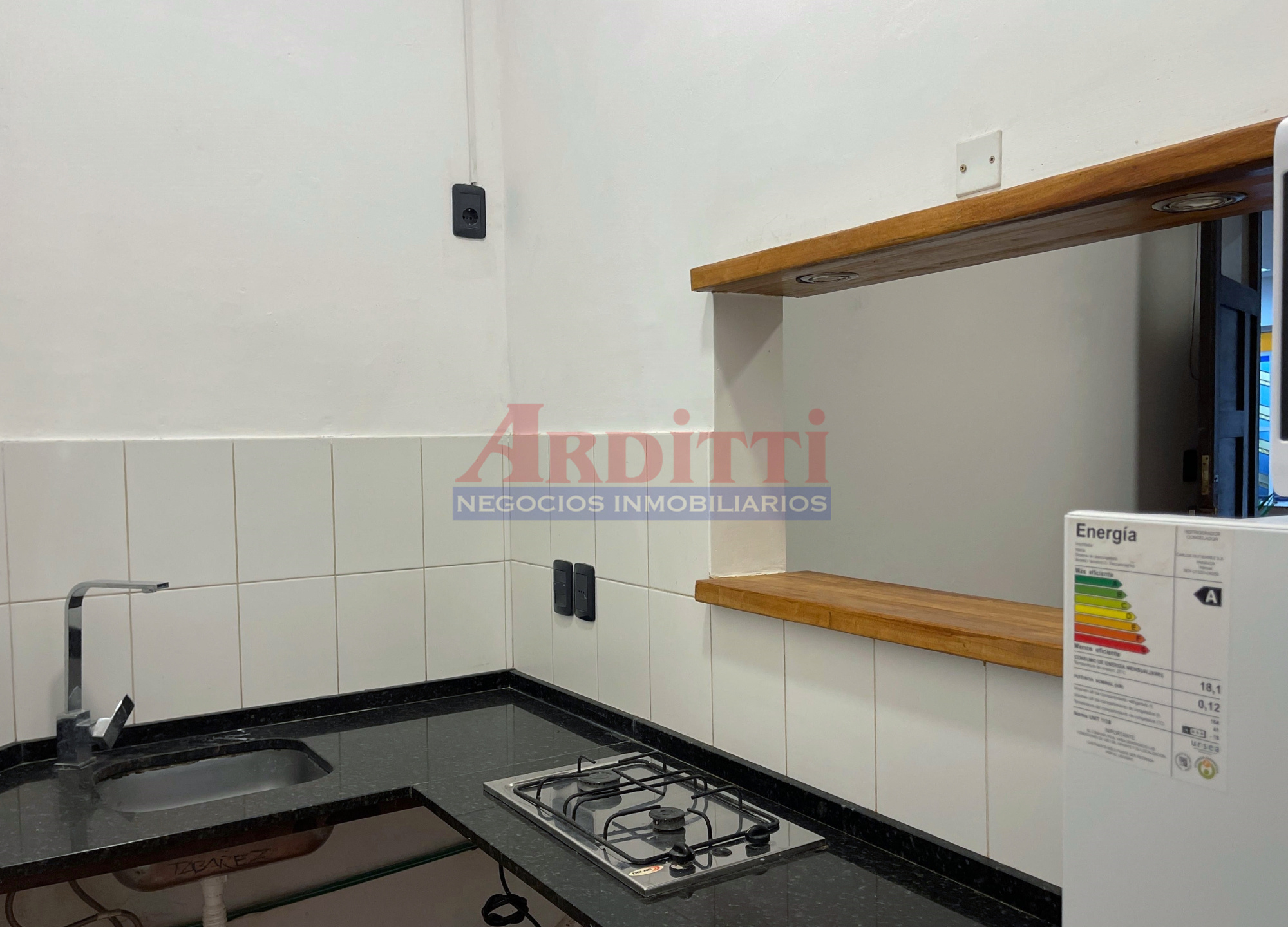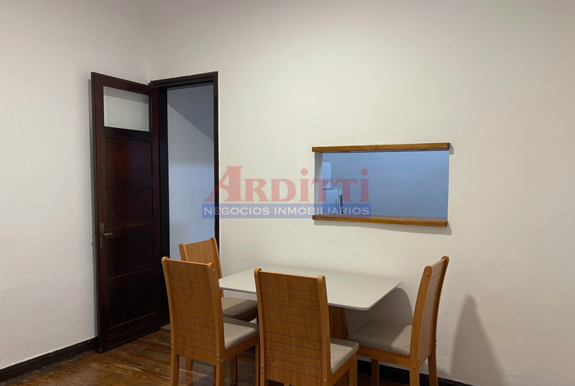 Living comedor con pasaplatos, 1 dormitorio, cocina definida con anafe, microondas y baño. 35m2
